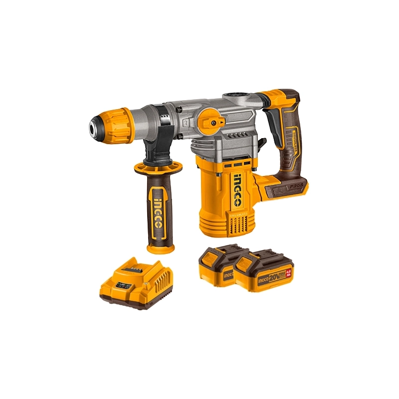 20 V. Motore BRUSHLESS. 4,5 J. 0-930 giri/min. Perforazione max 28 mm su calcestruzzo. Luce led integrata. Con 3 punte (8, 10, 12 mm), 1 scalpello, 1 tubetto di grasso e 1 chiave inglese. Fornito con 2 batterie da 4 Ah e caricabatterie. In valigetta.
