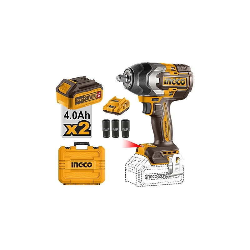 20 V. Brushless. Attacco 1/2'. Velocita' a vuoto 0-1600/2400 giri/min. Coppia max 850 Nm. Con 2 batterie da 4 Ah e caricabatterie. Luce led integrata.