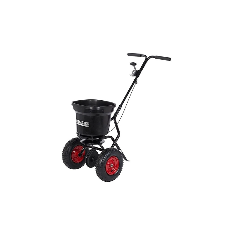 Seminatrice rotante con ruote. Dotata di dispositivo per il controllo e lo stop della semina. Larghezza diffusione 3-3,5 m. Portata 23 kg.