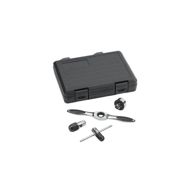 Set composto da 5 pz, portafiliera a cricchetto con adattatore per filiere da M3 a M8 (diametro filiera max 25,4 mm), giramaschi a cricchetto con 2 adattatori per maschi da M3 a M6 e da M6 a M12, in valigetta plastica.