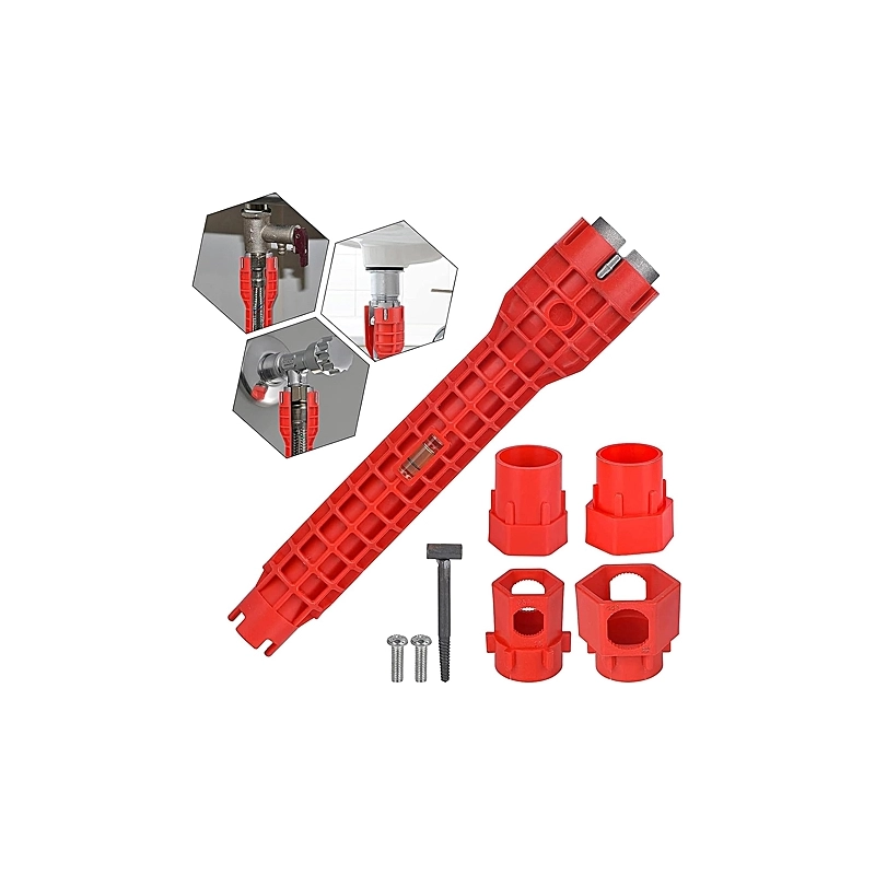 Chiave multifunzione per rubinetti. Telaio in abs e componenti in lega di alluminio. Perfetta per lavorare su dadi, valvole, cestelli per filtri e molto altro. Consente di lavorare comodamente sotto i lavelli raggiungendo spazi stretti difficili da raggiungere con altri utensili.