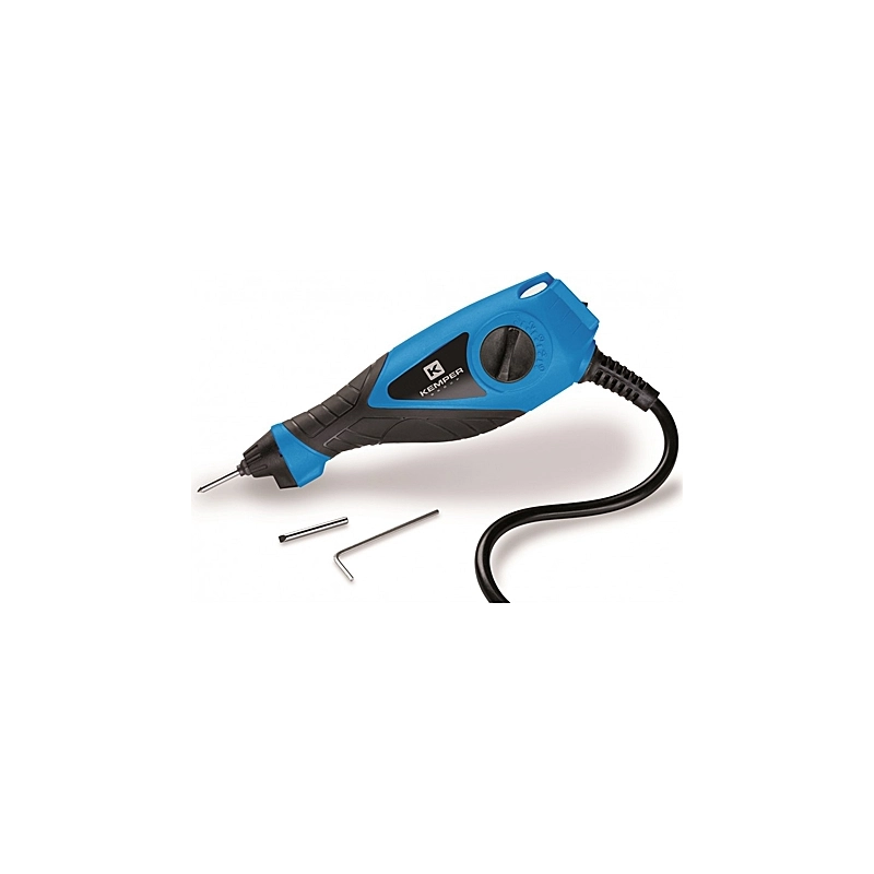 Incisore elettrico con 5 potenze regolabili. 13 Watt. 7200 giri/min. Impugnatura ergonomica in gomma. Punta in carburo di tungsteno. Dotata di gancio di sospensione. Ideale per incisioni di precisione su legno, metallo, plastica e vetro. Punte di ricambio al tungsteno dritta e curva e due stencil inclusi nella confezione.