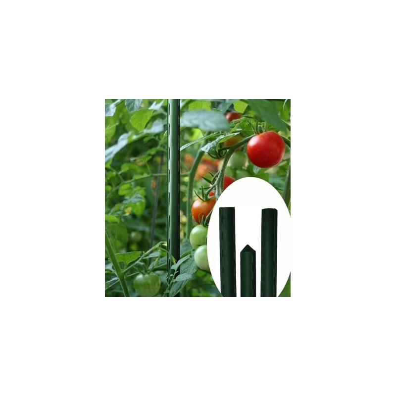 Canne reggipiante in acciaio plastificato a caldo con struttura interamente sigillata e quindi antiruggine. La struttura e' interamente ricoperta longitudinalmente di zigrinature in rilievo per facilitare la legatura delle piante. Modello = altezza cm/diametro mm