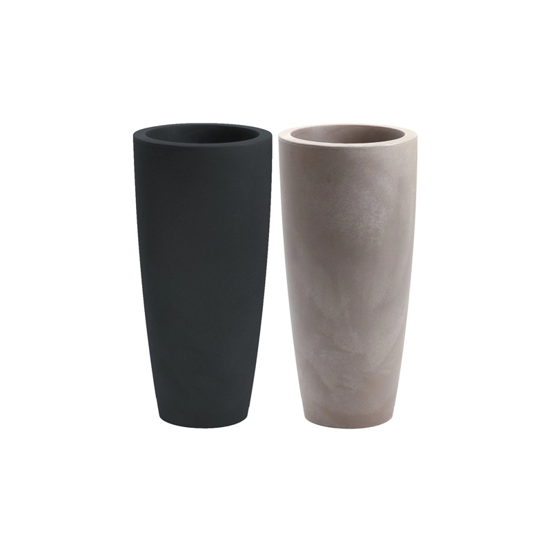 Vaso a forma conica prodotto in resina con superficie matt, leggermente ruvido al tatto. Modello = colore/dimensioni (diametro x altezza cm)