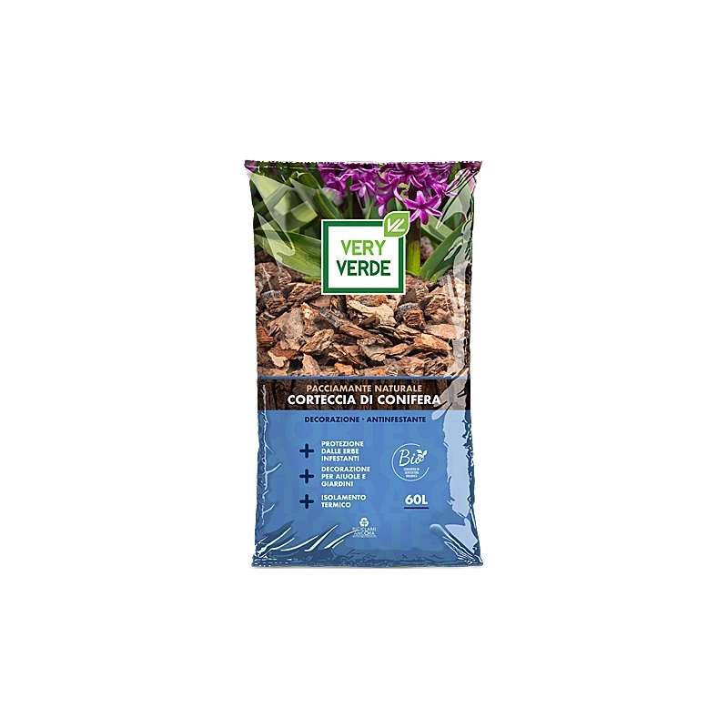 La corteccia di conifera agisce con diserbante naturale contro la crescita delle erbe infestanti ed esercita un'azione di isolamento termico e decorativo. Contenuto l 60