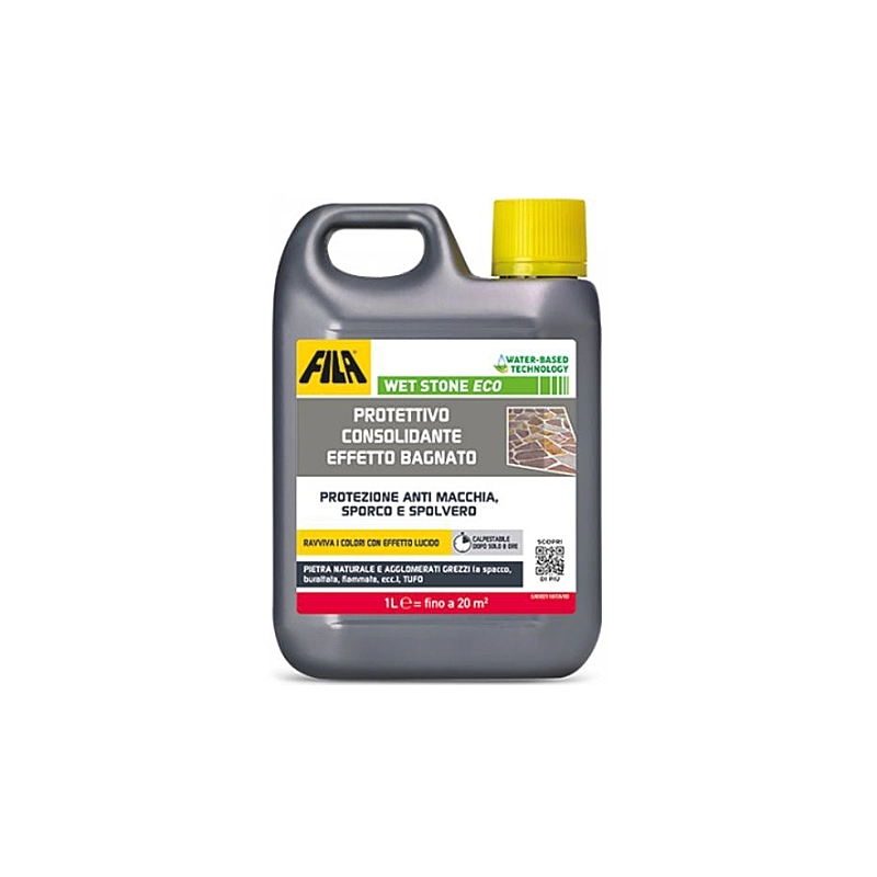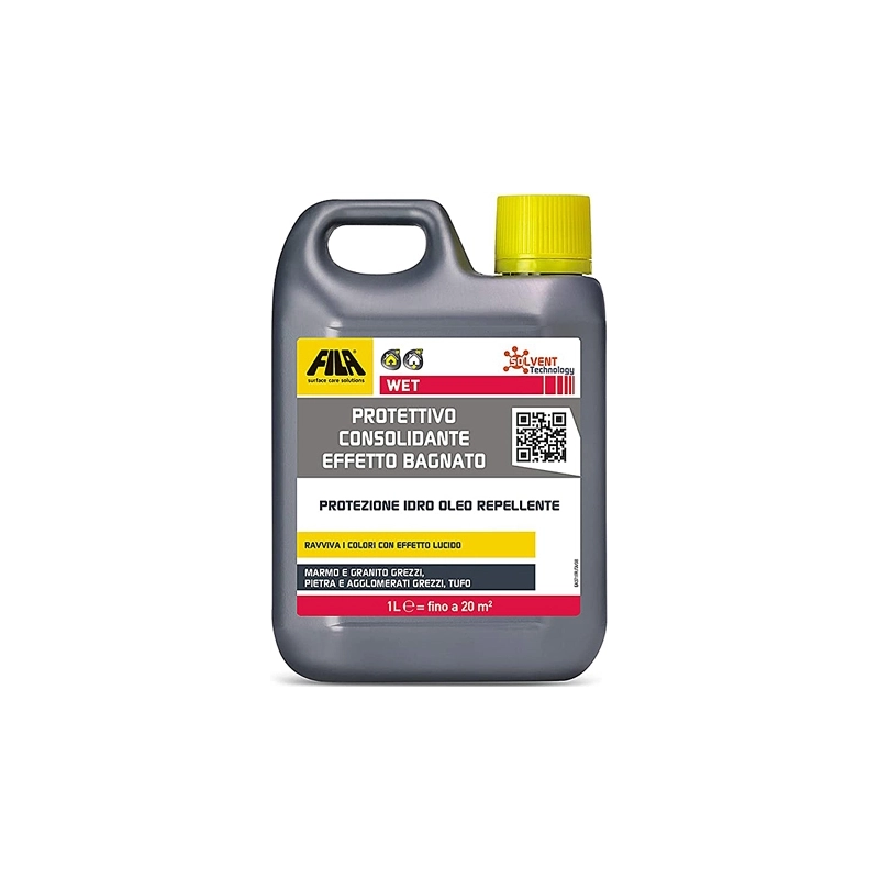 Protettivo a effetto bagnato per pavimenti in pietra naturale, marmo, granito, pietre locali, travertino, a finitura grezza. Protegge il materiale da acqua ed olio. Non ingiallisce in nessuna condizione ambientale e di invecchiamento. Non si scrosta. Base acqua. Contenuto 1 lt.