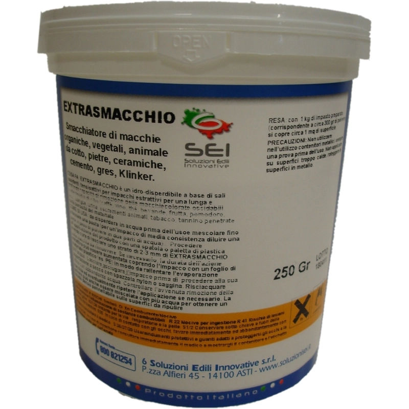 E' una polvere da diluire in acqua a base di sali ossidanti e tensioattivi, per impacchi estrattivi di rimozione delle macchie colorate (caffe', vino, the', bevande,frutta, sangue, tannino, ecc...) penetrate nelle porosita' del materiale. Contenuto ml 250