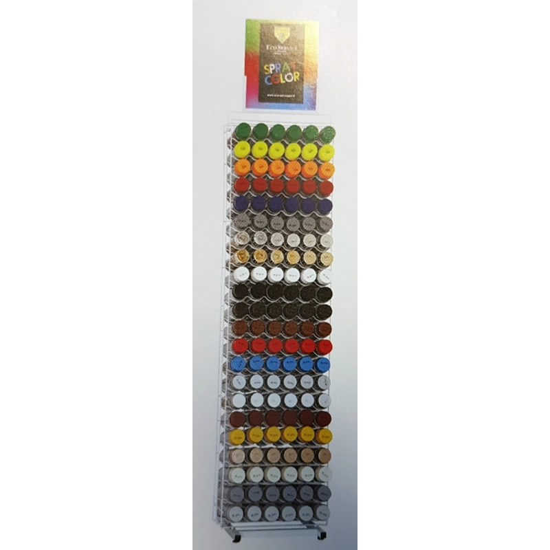 Espositore vuoto in metallo da pavimento per colori spray. 132 posti (6 posti in orizzontale per piano per 22 file in verticale). Piedini regolabili. Dimensione cm. 49x35x177h