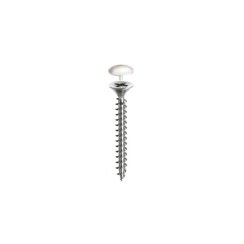Viti in acciaio con trattamento lubrificante antifrizione. Testa svasata piana con cava speciale per alloggiare cappucci. Modello = diametro mm/lunghezza mm/filettatura