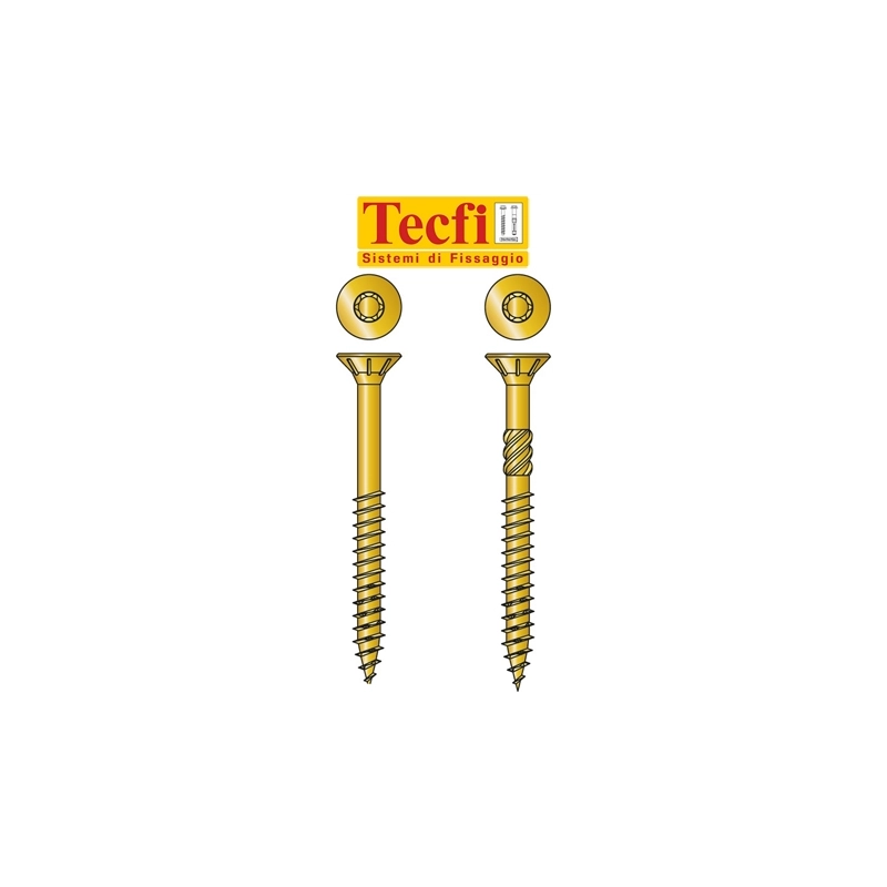 Viti in acciaio con trattamento lubrificante. Testa svasata piana a cava torx con alette fresanti sottotesta. Zincatura gialla (esente CrVI). Certificata CE secondo EN 14592:2008+A1:2012. Con alesatore a partire dalla lunghezza 50 mm, diametro 4 mm. Modello = diametro mm/lunghezza mm/filettatura/misura torx
