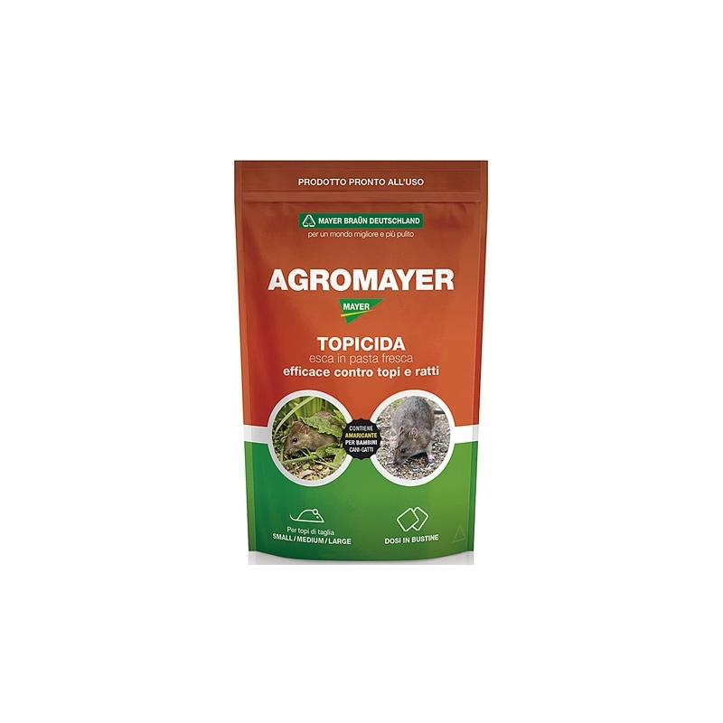 Topicida in buste di pasta fresca, efficace contro topi, ratti, ed arvicole. Essendo aromatizzato alla carne risulta essere particolarmente attrattivo anche verso le talpe. Composizione: BROMADIOLONE, Denatonium Benzoate, sostanze appetibili ed adescanti. Contenuto 1,5 kg.