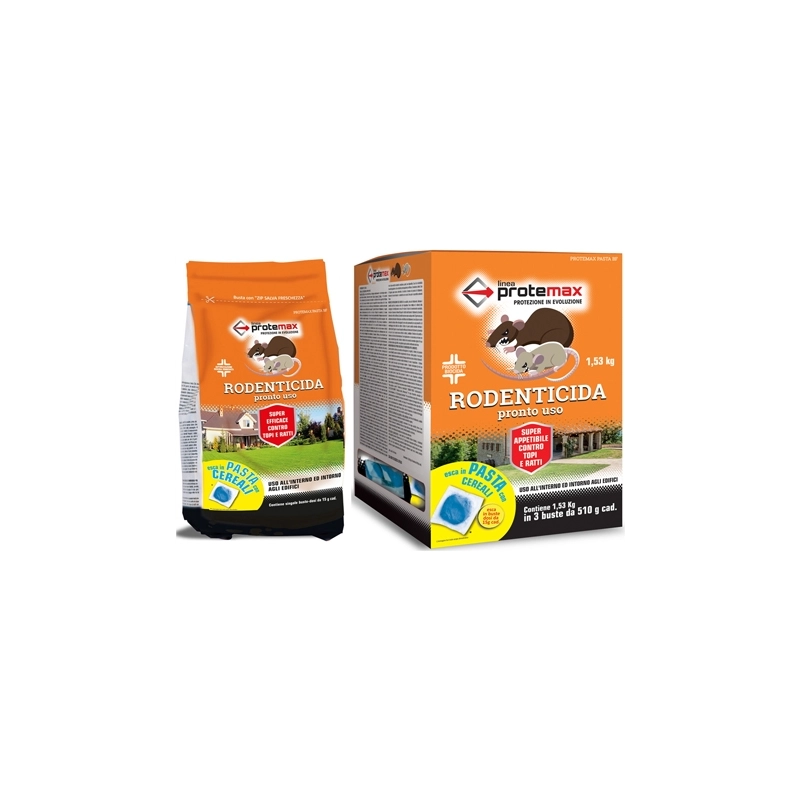 Rodenticida in pasta fresca pronta all'uso. Ideale per il controllo d'infestazioni da topi e ratti. Principio attivo Brodifacoum 0,0029%. Il formato professionale e' disponibile in busta da KG 1,5 o 3 buste da 500 gr non vendibili singolarmente. Modello = formato gr/destinazione uso