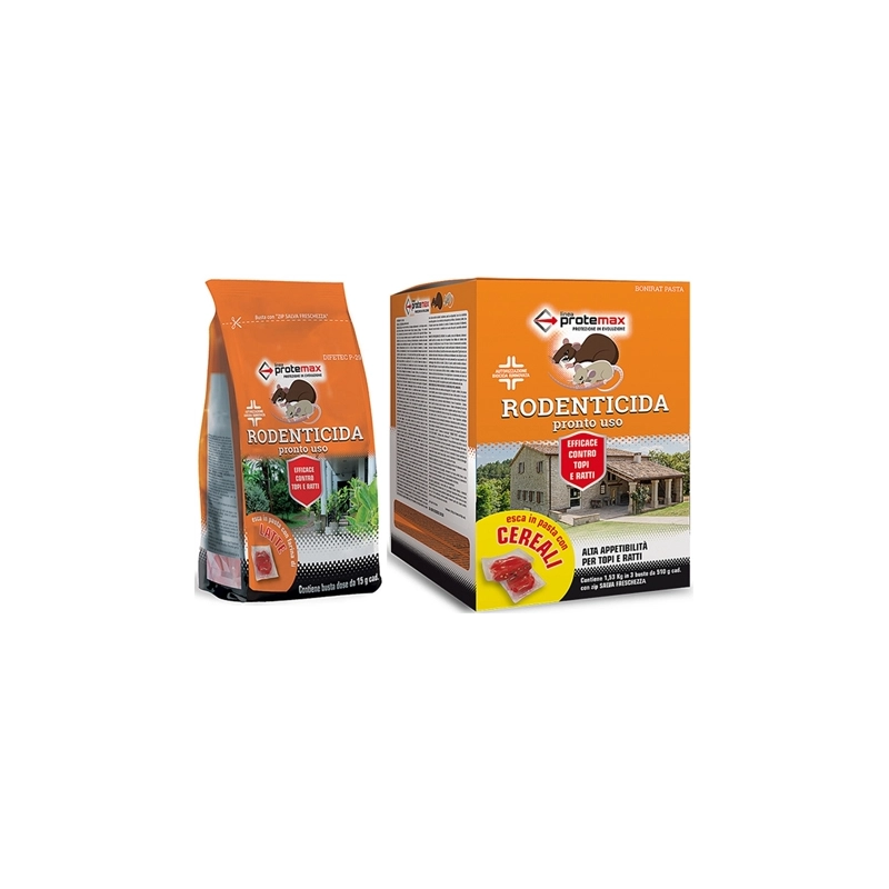 Rodenticida in pasta fresca pronta all'uso. Ideale per il controllo d'infestazioni da topo domestico e ratto grigio. Principio attivo Difenacoum 0,0029%. Il formato professionale e' disponibile in busta da KG 1,5 o 3 buste da 500 gr non vendibili singolarmente. Modello = formato gr/destinazione uso