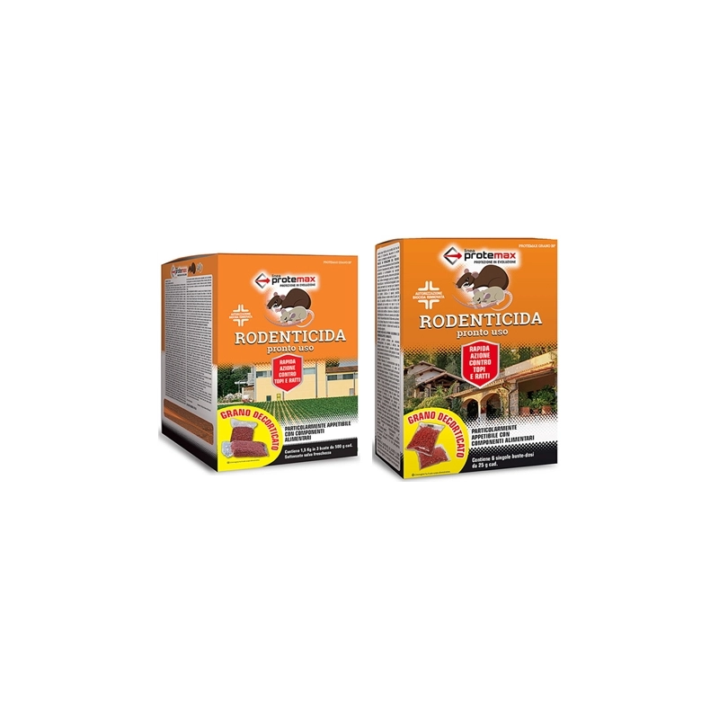 Esca in grano decorticata, aromatizzata, estremamente efficace verso topi e ratti. Indicato per ambienti domestici o civili. Utilizzare con i contenitori di sicurezza per esche. Principio attivo Brodifacoum 0,0029%. Il formato professionale e' disponibile in busta da KG 1,5 o 3 buste da 500 gr non vendibili singolarmente. Modello = formato gr/destinazione uso