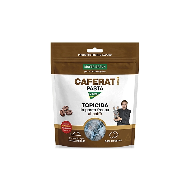 Esca in pasta con aromatizzazione al caffe'. Principio attivo: BRODIFACOUM. Concetrazione 0,0025% secondo le normative vigenti. Per topi di taglia S, M. Contenuto 150 gr.