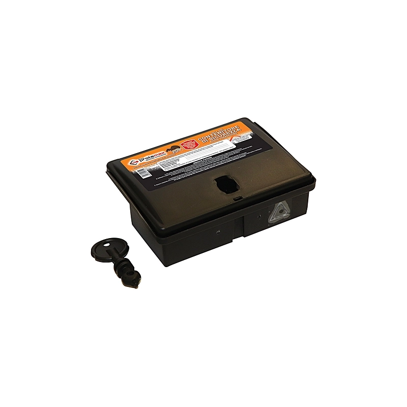 Stazione di sicurezza per esche topicide. In plastica resistente nera. Dotato di chiusura di sicurezza con chiave. Indicata per il topolino domestico. Dimensioni 13x9x4 cm.