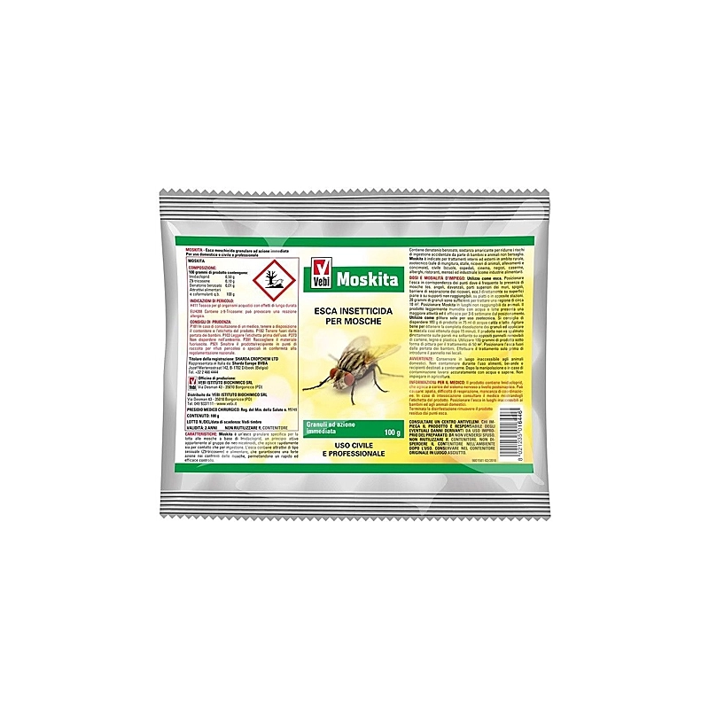 Con attrattivo ad azione immediata per l'eliminazione delle mosche. Busta da gr 100