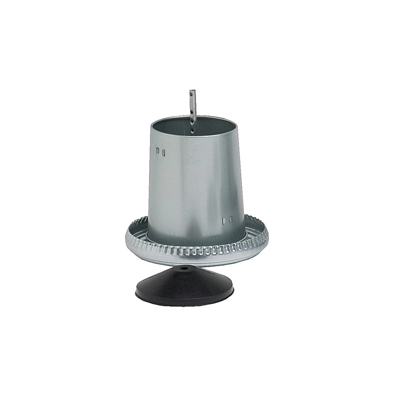 Mangiatoia in metallo con coperchio composta da un piatto, un cilindro e un coperchio. Modello = portata kg/Dimensioni mm (h x diam.)