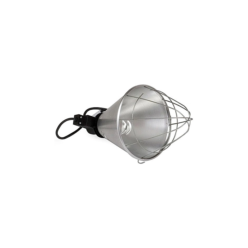 Riflettore per avicoltura in alluminio. Completo di cavo, spina, portalampada attacco E27 e rete di protezione in robusto filo zincato. Fornito senza lampadina.