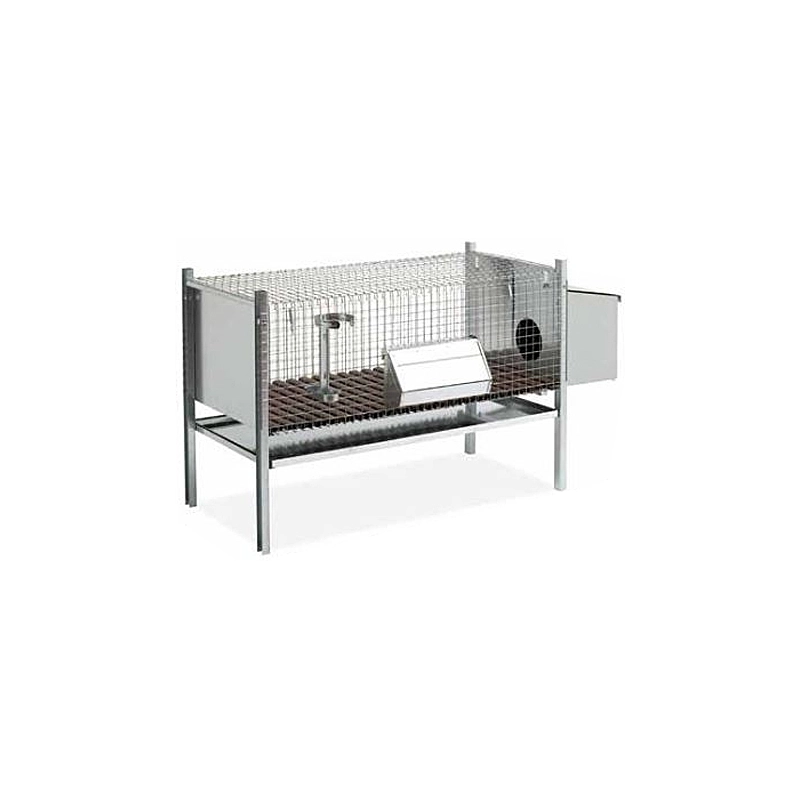 Gabbia ad uno scomparto con fondo in plastica sovrapponibile con accessori tappi da ordinare separatamente. Con nido per fattrice. Altezza interna 33 cm. Dimensioni 53x128x70h cm. Completa di abbeveratoio portabottiglie, mangiatoia a 3 settori e padella.