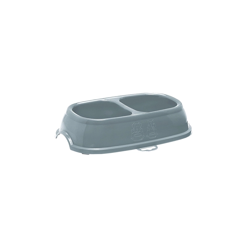 Ciotola doppia in plastica per cani e gatti di piccole dimensioni. Con piedini antiscivolo. Dimensioni 28x17x6h cm. Capacita' 0,4+0,4 lt.