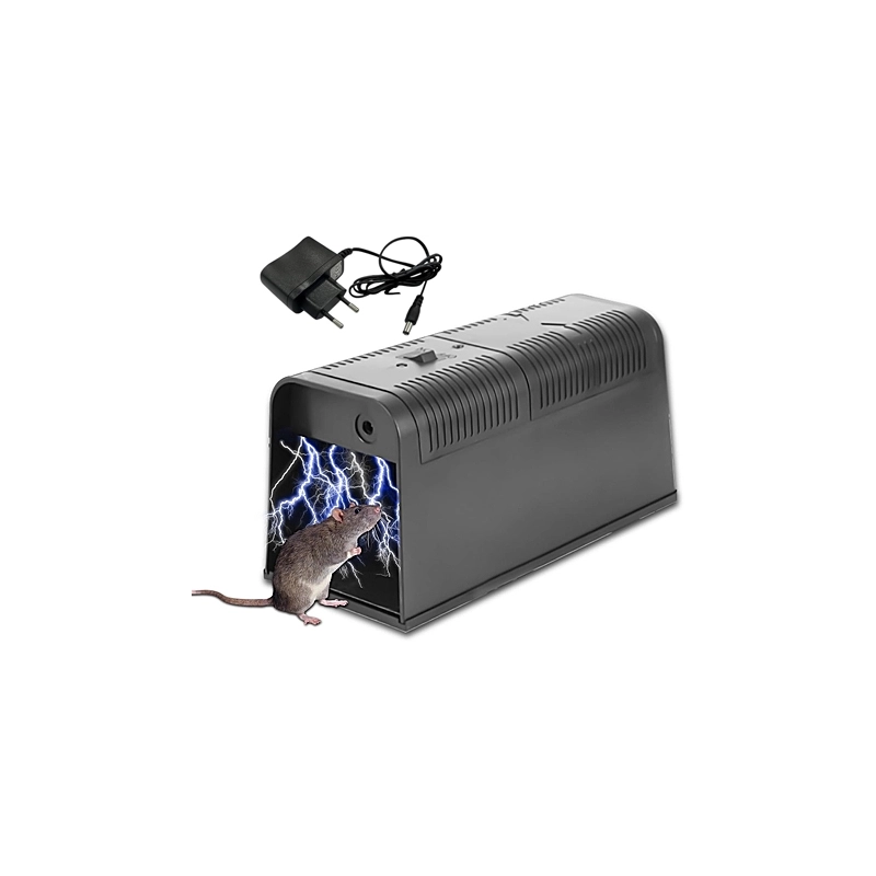Trappola elettronica con scarica 5000V, per topi, ratti, ecc. 2 led: verde indica che il dispositivo e' acceso, rosso lampeggiante che c'e' stata un cattura. Dimensioni 23,5x10,2x11,3h cm. Funziona con 4 batterie LR14 (6V) non incluse.