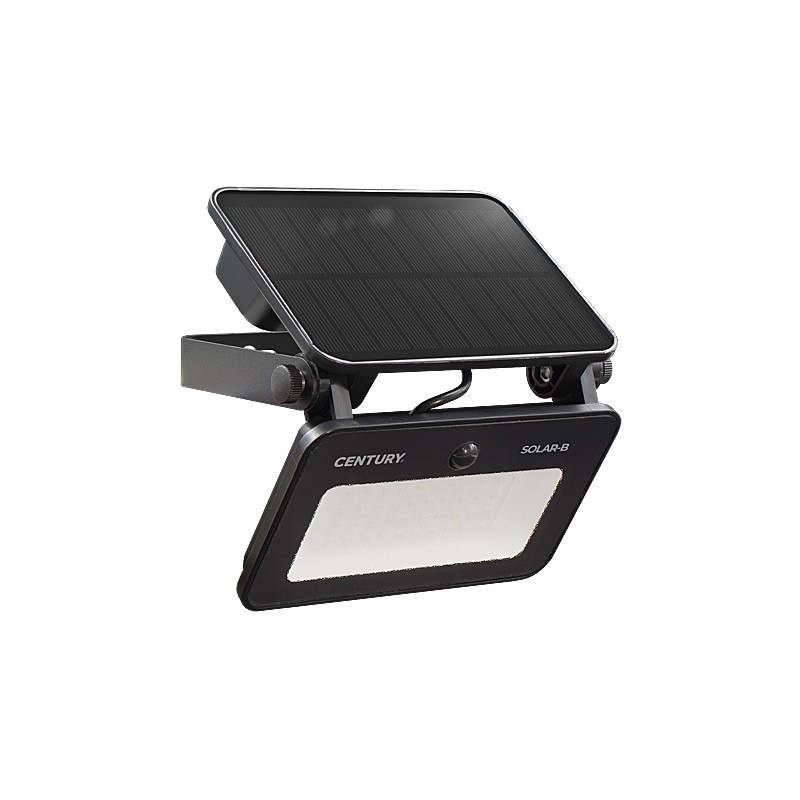 Proiettore solare compatto con pannello fotovoltaico. 3 luminosita' selezionabili (3000-4000-6500 K). IP65. Con sensore di movimento. Modello = Watt/Lumen