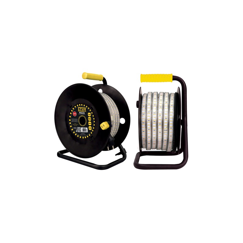 Striscia Led da lavoro. 19230 lumen. Impermeabile. Nastro luminoso Led 15 mt con avvolgitore. 180 Watt. Funziona tra temperature comprese -10 a +40 gradi. 4000K. Cavo di alimentazione da 1,5 mt ed e' munito di spina europea CEE 7/7 (schuko).