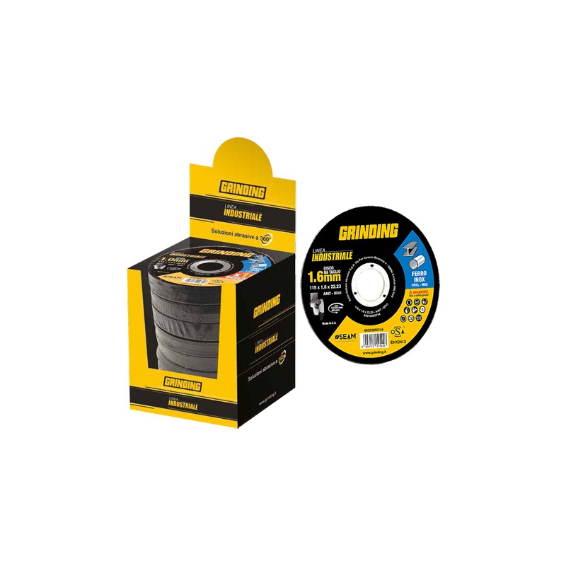 Disco abrasivo all'ossido di alluminio. Esente da ferro, zolfo e cloro (<0,1%). Taglio veloce preciso e confortevole. Modello = dimensioni mm/tipo/box da pz