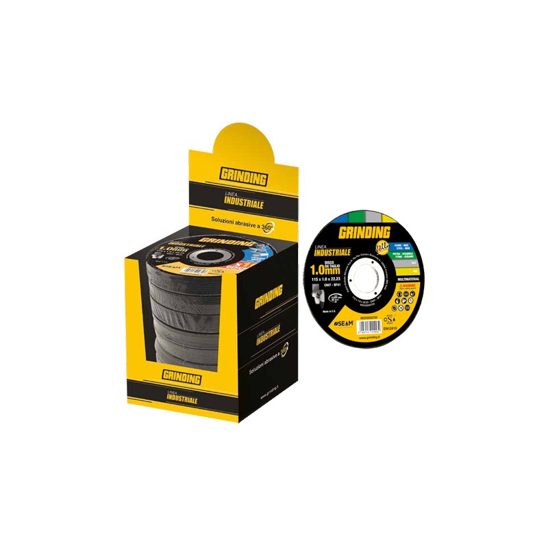 Mole abrasive resinoidi. A centro piano. Per il taglio di medie sezioni di materiali quali acciaio inox, alluminio, pietra, ceramica, plastica. Dimensioni mm 115x1,0x22,23. Box da 100 pz.