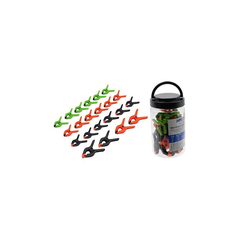 Set composto da 22 pz di morsetti a molla. Per officina, hobby e fai da te. Contenuto 18 pz lunghezza 60 mm con apertura 25 mm e 4 pz lunghezza 90 mm con apertura 40 mm. Colori assortiti verde, arancione e nero. In barattolo di plastica.
