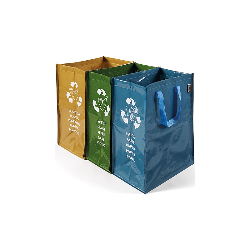 Kit 3 borse per carta, vetro, plastica con clip magnetiche e maniglie. Dimensioni (LxH) cm 35x49